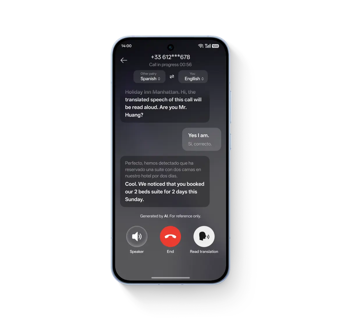 ابقَ على اتصال أينما تأخذك الرحلة؛ حيث يوفر مترجم المكالمات ترجمة فورية أثناء المكالمة. أصبح حجز طاولة، أو طلب وسيلة نقل، أو تأكيد خططك أمراً سهلاً للغاية. لا حاجز للغة، مجرد تواصل مستمر.