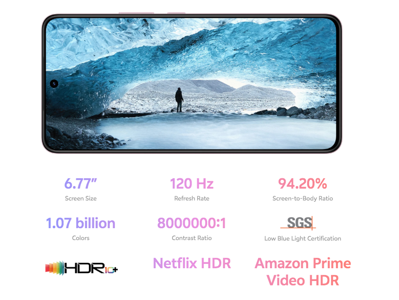 | معلومات الشاشة | 6.77 بوصة 1080 × 2392 بكسل (~388 ppi density )AMOLED، 1B لون، 120 هرتز، HDR10+ |