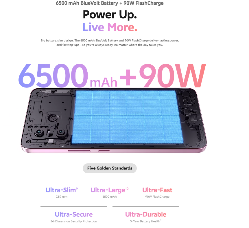 | البطاريه | ليثيوم أيون سعة 6500 مللي أمبير ، 90 وات سلكي عكسي 100% في 52 دقيقة 6 وات سلكي عكسي |